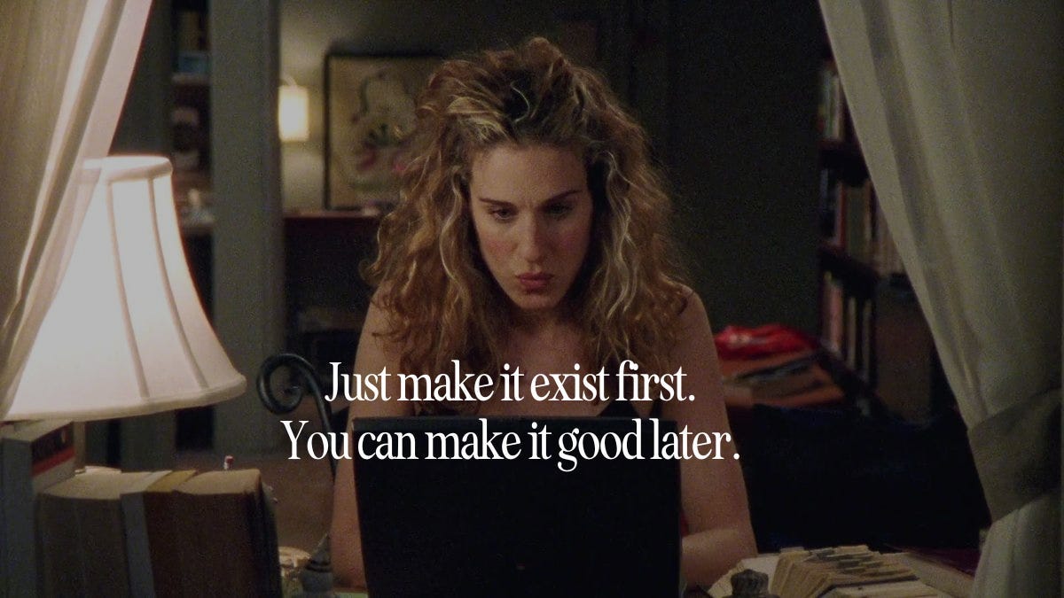 I saw this image on Substack recently that resonated with me so much—when people ask about my writing process, it really comes down to just getting shit on a page. It’s not about how well you write; it’s about how well you rewrite. The hardest part is getting that first draft down, but the tweaking and editing is the fun part. So if you’re scared to start a project (whether it’s starting your own Substack, writing a book, or a movie) just START.