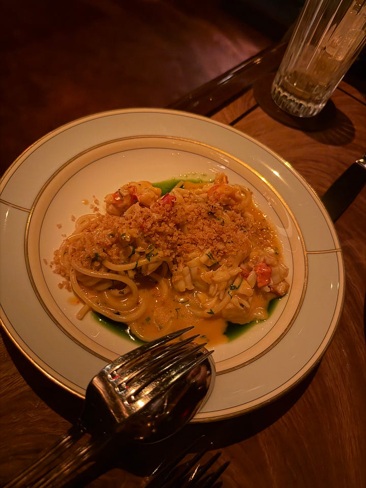 The restaurant itself is super tiny, so it feels incredibly luxe and intimate once you’re inside. If you go, order a fluffy margarita, creamed corn pot pie, the 86 cheese stake, potato croquettes with caviar, the Waldorf salad, the lobster spaghetti, and at least two desserts. And don’t wear jeans because you will leave fucking stuffed.